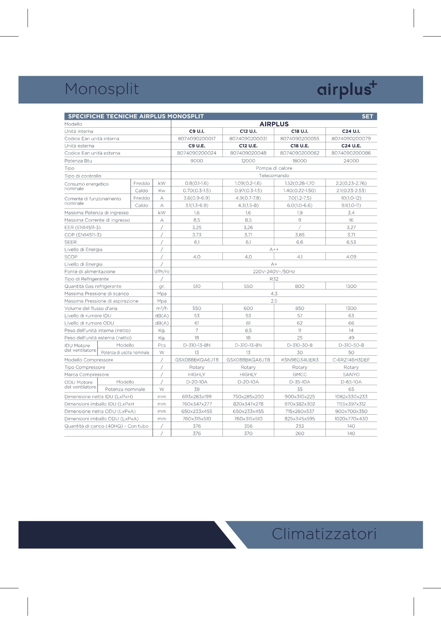 I climatizzatori AIRPLUS TERMOTEK sono disponibili nelle potenze da 9OOO a 24OOO BTU sia nelle versioni monosplit che multisplit.
